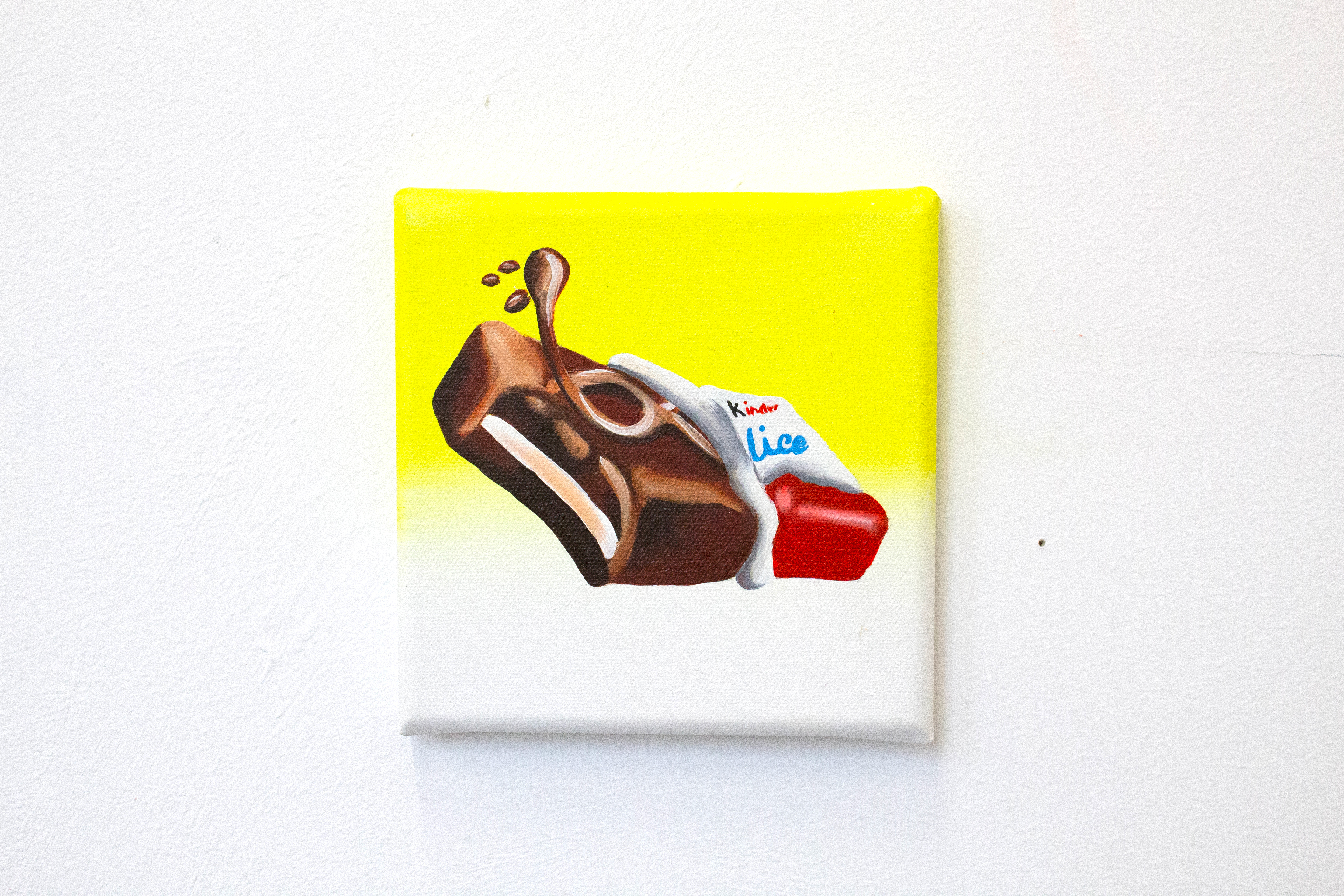 Les peintures-goûters, série de cinq peintures à l’acrylique et à l’huile sur toile, 15x15cm chacune, réalisées durant la résidence Création en cours (Ateliers Médicis) en 2025 en Mayenne.